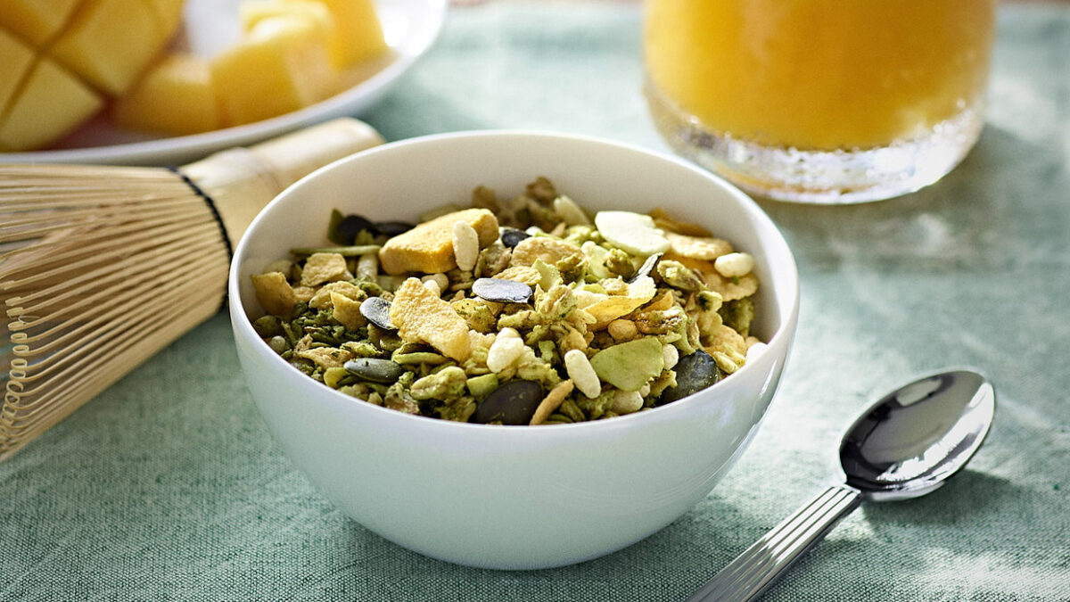 Knusprig, fruchtig, farbenfroh – unser neues Mango-Matcha-Müsli