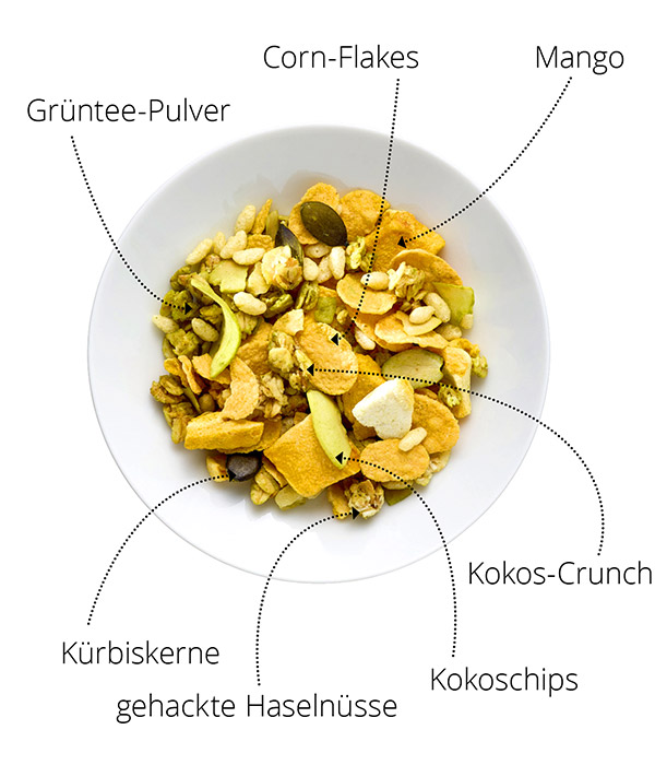Ob mit Joghurt oder Milch – das Mango-Matcha-Müsli ist ein echter Hingucker, der am Buffet direkt ins Auge fällt.